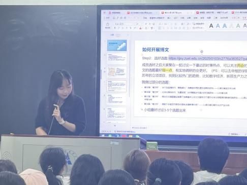 胡子瑄结合自身经历,将博文杯从“0”到“1”的过程作深度剖析,帮助同学们掌握从选题到撰写的基本方法策略。她首先明确博文杯的“科研启蒙”核心定位,强调“紧扣时事热点、聚焦小切口、包含实地调研”三大原则,建议新生把握数字经济、新质生产力、绿能下乡等热门方向,找到适合自己的研究方向。