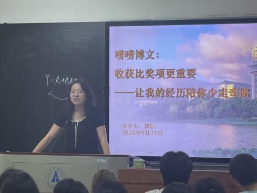 郭钰以“经历”励人,传递“科研重在成长”的理念。她鼓励同学们大胆尝试,积极参与“博文杯”等科研项目,并强调“过程收获远胜于结果奖项”的价值导向。她的分享让新生卸下“怕失败”的心理枷锁,转而以更积极的心态主动迈出科研第一步,为未来的学术探索注入勇气与动力。