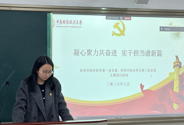 为深入学习贯彻党的二十届四中全会精神,激励担当作为,强化党员党性修养,2026年3月19日,经济学院本科生第一党支部及经济贸易学院本科生第三党支部在文泰楼115室联合召开三月份主题党日活动。活动由郭钰同志主持,两个支部全体党员参与。