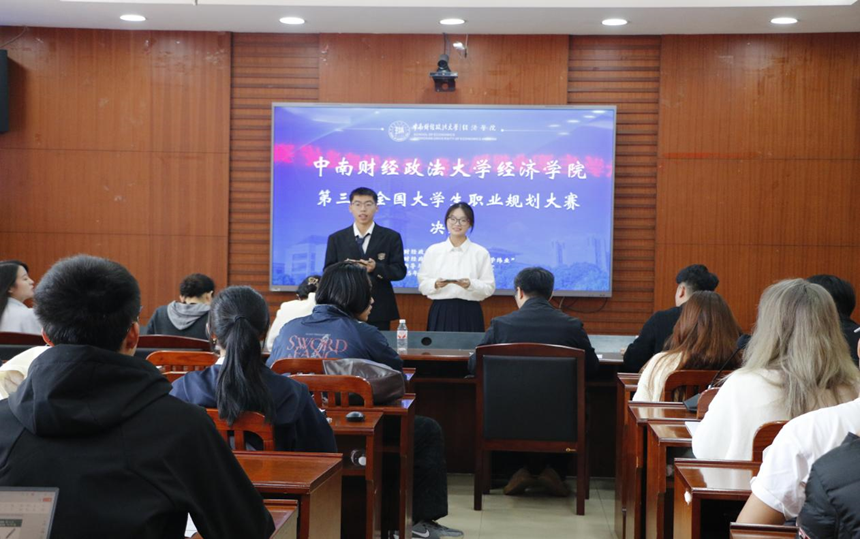 (学生通讯员 潘墨函 摄影 李小蒙)规划职业蓝图,启航青春梦想。为提升大学生职业素养,增强职业规划意识与主动性,促进高质量充分就业,经济学院第三届大学生职业生涯规划大赛学院选拔赛决赛于11月14日在南湖校区文泉楼206室顺利举行。经济学院学生工作办公室主任周琼,团委书记陈远瞻,2024级本科生辅导员孟庆红,2023级本科生辅导员包伦娜,中南财经政法大学经济学院企业导师、武汉市福州商会人才工作处副主任邓秦担任评委。校主持人工作室成员梁凯琳、孙浩然主持比赛。
