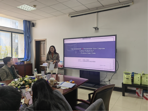 最后,中南财经政法大学何凌云副教授带来了题为《Can the government’s demand for AI drive corporate carbon productivity? Evidence from China》的报告,探讨了政府AI需求如何影响企业碳生产率,为理解数字技术如何赋能绿色转型提供了新的视角。与会师生针对政府AI采购的内容、基于供应链的政府采购的技术溢出问题以及政府AI赋能监管的现状等问题与何老师展开了讨论。