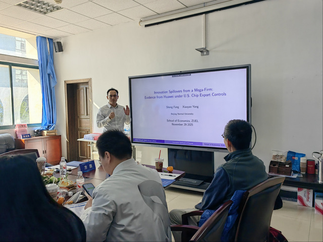 随后,北京师范大学方胜副教授分享了题为《Innovation Spillovers from a Mega-Firm: Evidence from Huawei under U.S. Chip Export Controls》的最新研究成果。研究利用华为在2019年后对美国芯片出口管制作出回应、跨县投资芯片企业的事件,发现华为的进入显著提升了当地其他芯片企业的创新产出和新企业进入,表明巨型企业在特定条件下能够产生积极的创新溢出效应,且这种效应在具备一定技术基础和获得政府共同投资的地区更为显著。与会师生就基于华为投资企业的溢出效应的类型、基于地理半径的溢出效应内生性规避等问题与方胜老师进行了细致讨论。