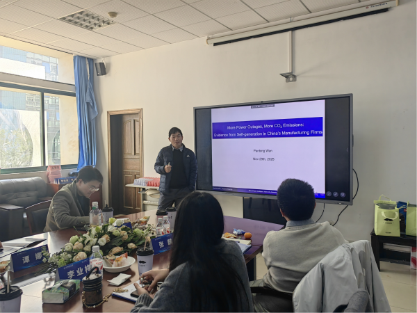 随后,武汉大学万攀兵副研究员以《More Power Outages, More CO2 Emissions: Evidence from Self-generation in China's Manufacturing Firms》为题分享了自己的最新研究成果。研究利用省级电网停电数据,发现停电会促使制造业企业,特别是非重点保障企业,通过启用效率较低的自备电厂进行发电以维持生产。这一能源替代行为导致了企业二氧化碳排放量的显著增加,揭示了电力供应可靠性在节能减排中的关键作用。与会师生就自变量的工具变量选择问题、水电替代火电可能导致的低估问题、自发电厂建设的主要影响因素以及“市场煤、计划电”的制度优化问题展开了讨论。
