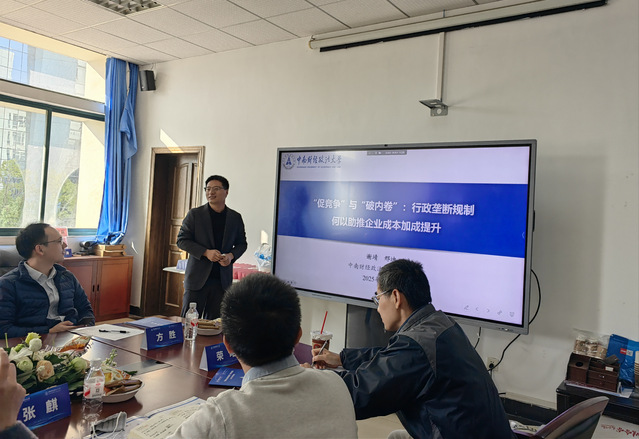接着,中南财经政法大学谢靖副教授以《“促竞争”与“破内卷”:行政垄断规制何以助推企业成本加成提升》为题作了学术报告。研究基于公平竞争审查制度这一准自然实验,发现规制行政垄断能有效提升企业成本加成,其作用渠道在于重塑企业竞争策略和加速低效产能出清,为破解“内卷式”竞争、建设全国统一大市场提供了重要的微观证据。交流环节中,与会师生针对样本处理的优化选择、行政垄断规制对异质性的规模与产权企业的差异性影响、研究的市场结构设定等问题展开了激烈的讨论。