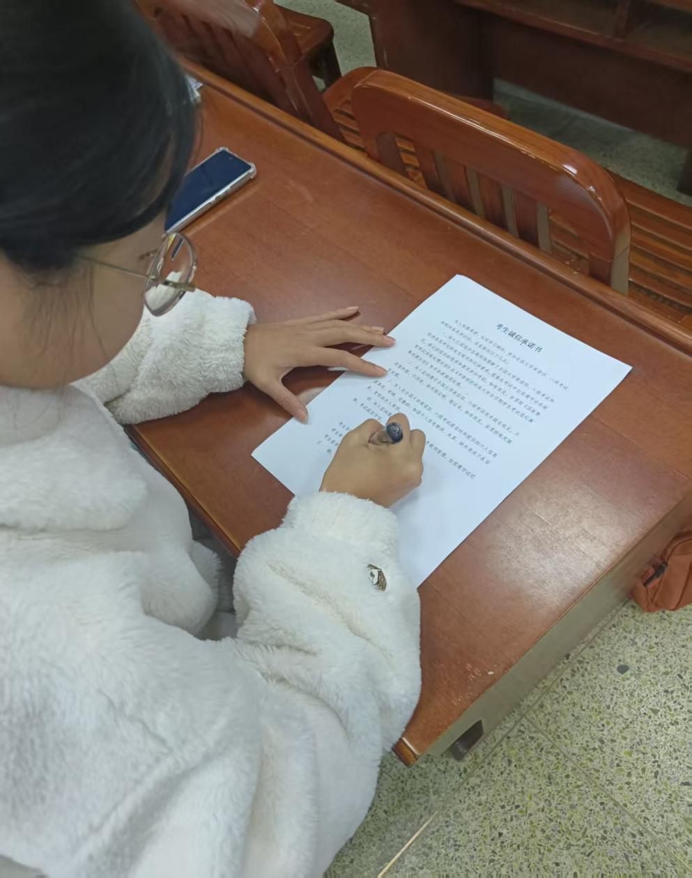 宣讲结束后,同学们依次在诚信承诺书上郑重签下自己的姓名。签名的过程不仅是一种形式,更是一份承诺与责任的传递,让每一位同学都深刻认识到诚信考试的重要性,进一步筑牢了诚信应考的思想防线。此次活动的开展,有效引导了同学们树立正确的考试观念,为营造风清气正的考试环境奠定了坚实基础。