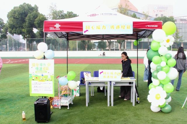 活动当天,学院工作人员早早抵达现场,迅速且有条不紊地开展摊位布置工作。色彩鲜艳的气球、醒目的活动主题横幅、补给区丰富的饮料与零食,崭新的运动道具,每一步都旨在营造温馨且充满活力的展位环境,处处都彰显着志愿者们的用心与热情。