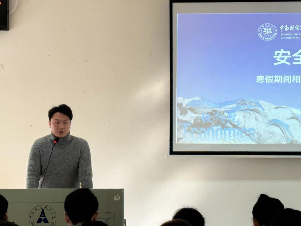 为总结学期工作、引导学生合理规划学业与未来发展方向,加强寒假期间安全教育,2026年1月9日上午,中南财经政法大学经济学院2025级本科生第一学期期末大会顺利举行。本次会议由2025级本科生辅导员陈远瞻老师主持,经济学院院长石智雷、万学教育湖北分校校长谭晓禹受邀出席,2025级全体学生参加。