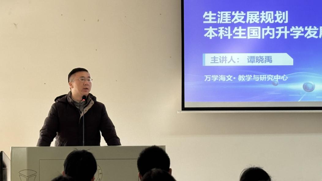 接下来,谭晓禹为同学们带来了一场系统而实用的升学指导讲座。他围绕保研与考研两条路径,从学校政策解读、时间节点、备考策略等方面进行了详细说明,并结合往年成功案例,为同学们提供了有针对性的建议。谭老师鼓励同学们尽早明确方向,合理规划,扎实准备,为顺利升学和职业发展做好充分准备。
