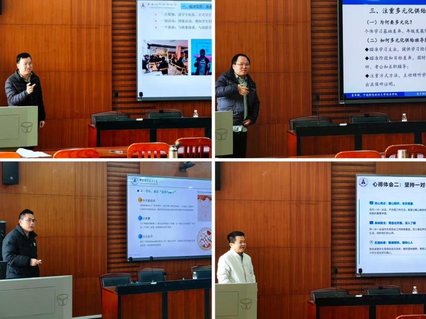 最后,在经验分享环节,荣获2025年度考核“优秀”的班级导师——陈语、周强、袁华锡、张麒分别作经验交流。他们结合鲜活案例,从“分阶段指导学生生涯发展”“识别学生需求与开展帮扶”“构建信任型师生关系”“学业与生涯协同指导”等角度,分享了各自在班级导师岗位上的实践心得与育人感悟。他们的分享内容兼具理论性与实操性,为在场导师提供了宝贵的借鉴与启发。
