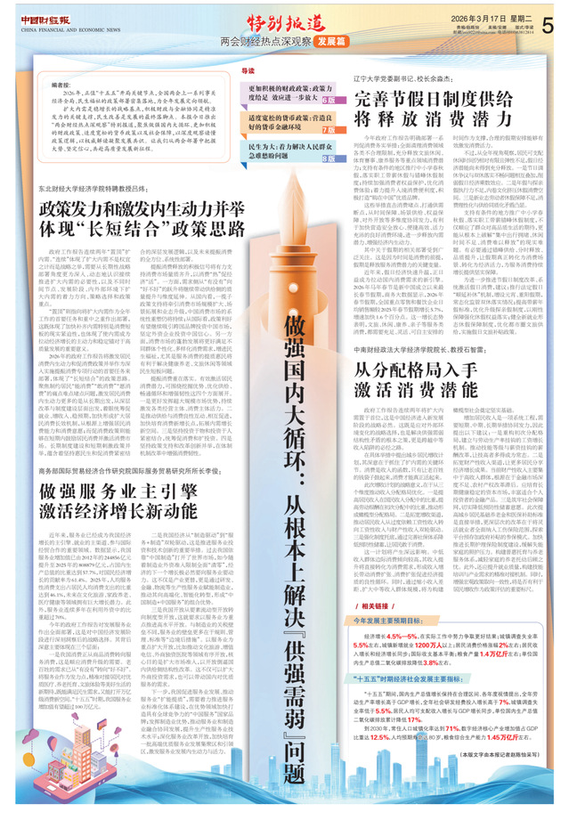 2026年是“十五五”开局关键节点,全国两会上一系列扩内需、促消费的政策部署为全年经济发展定向领航。中南财经政法大学经济学院院长、教授石智雷受邀就两会财经热点接受《中国财经报》专访,“从分配格局入手,激活消费潜能”。
