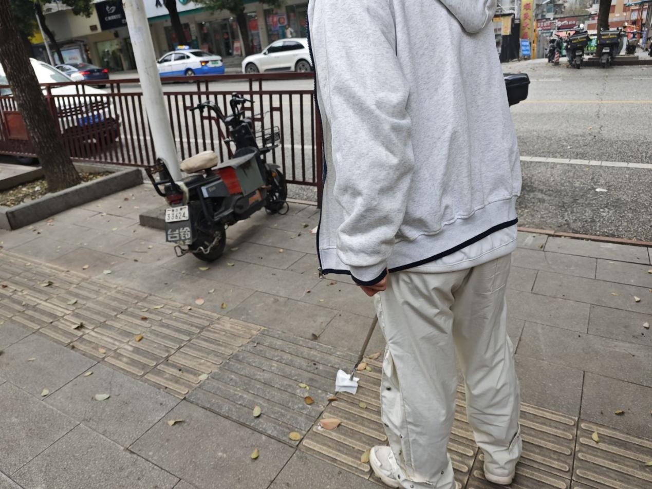 落叶紧贴在盲道的凹槽中,烟头和纸屑随处可见,志愿者们一边提着垃圾袋,一边弯腰清理这些“障碍物”,在打扫过程中还将停放在盲道上阻拦出行的共享单车搬至正确的位置。盲道不仅仅是地上凹凸有致的花纹,更是视障人士出行的眼睛。清理盲道,是为了更好地守护视障人士的安全。