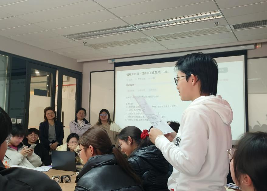 在核心分享环节,公司领导以PPT形式展开专业讲解,从金融行业整体架构切入,系统介绍银行、证券、基金、信托四大金融业态的核心职能,重点拆解银行的资金融通、证券的资本运作逻辑,结合行业数据与实际案例,清晰呈现银行、证券行业的发展规模、核心业务类型及主流岗位的能力要求,将课堂上的抽象金融知识转化为具象的行业实务内容,帮助学子搭建系统化的金融行业认知框架。随后的职业规划板块,主讲嘉宾结合金融行业就业现状,从专业知识积累、实践能力提升、职业证书备考等方面给出针对性建议,重点介绍金融挑战赛等学科竞赛的参与价值,为学子制定大学阶段的学习与发展目标提供清晰指引。