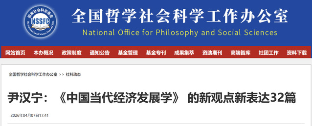 近日,全国哲学社会科学工作办公室官网刊发了我院尹汉宁校友撰写的《〈中国当代经济发展学〉的新观点新表达32篇》,文章围绕构建中国自主经济学知识体系展开系统阐释,引发学界广泛关注。