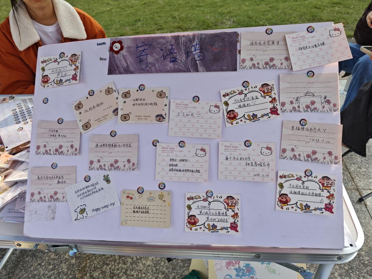 移步不远处,素白展板前早已热闹起来,一张张贴纸缀成冬日里盛放的“向阳花”。有人提笔感念保洁阿姨的日常辛劳,有人手绘冒着热气的奶茶传递暖意,还有人以诗意文字注解心底温情,层层叠叠的字迹里,满是